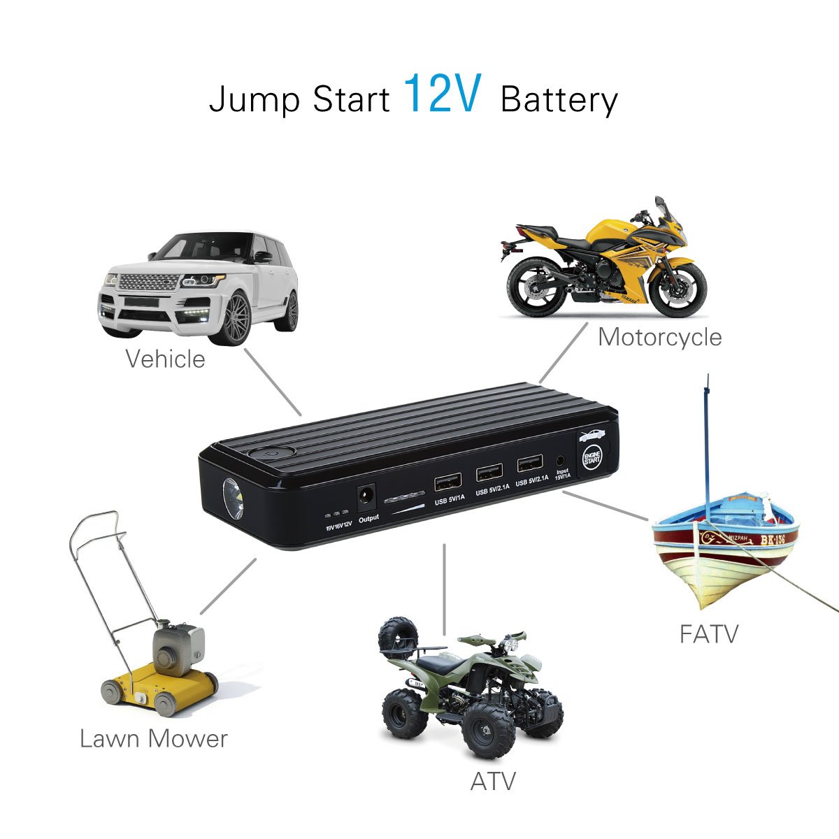 Racchiude tante funzioni insieme, per la precisione  4 accessori in uno: Motore d’avviamento d’emergenza adatto per batteria auto barca veicolo da 12V, torcia a LED incorporata per SOS, Power bank portatile da 12000 mAh  ,  Caricatore esterno pacco batterie per Smartphone, tablet, portatili e altri dispositivi digitali